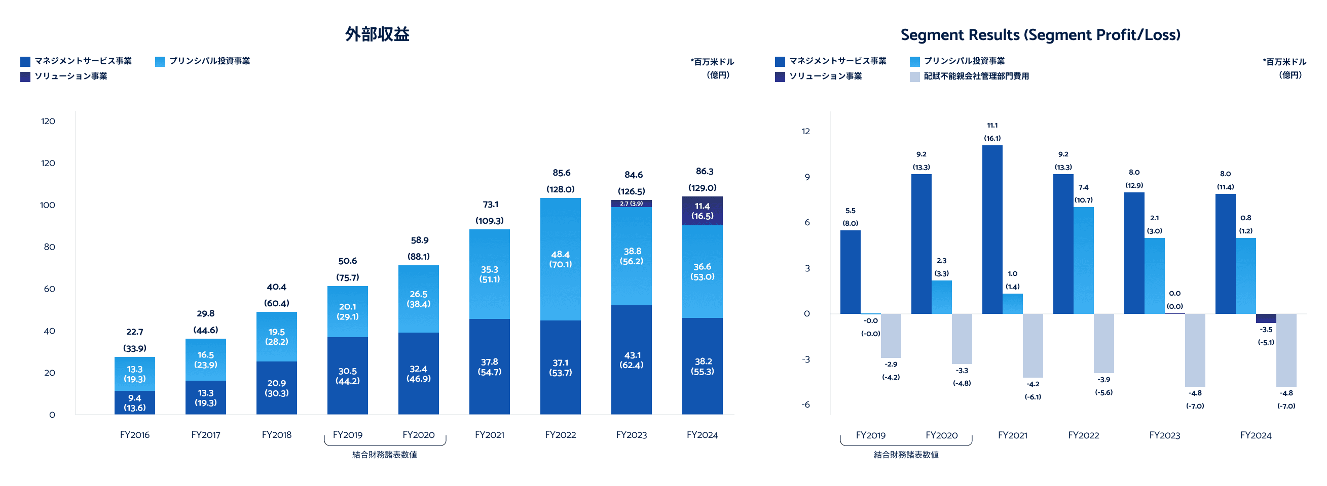 2016年12月期から2018年12月期については、2019年12月期以降と同区分のセグメント損益管理を行っていないため、セグメント損益は未作成。また、2022年12月期以前のプリンシパル投資事業のセグメント損益には、アイペット損害保険株式会社(2020年10月1日以降は、アイペットホールディングス株式会社)の保有株式に係る純損益を通じて公正価値で測定する金融資産の評価益を含む(2019年12月期:1.1百万米ドル、2020年12月期:0.8百万米ドル、2021年12月期:- 0.1百万米ドル、2022年12月期:4.9百万米ドル)。2023年12月期以降のプリンシパル投資事業の業績からは、株式会社SOLIAの業績を除外。 2023年12月期におけるソリューション事業の業績は、決算短信とは異なり、サプライチェーン領域(監査済)及びマネジメントサービス事業と合算されていたDX・インタラクティブ領域の業績(未監査)を使用